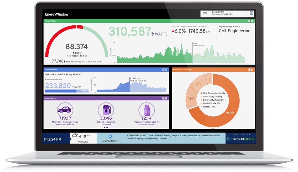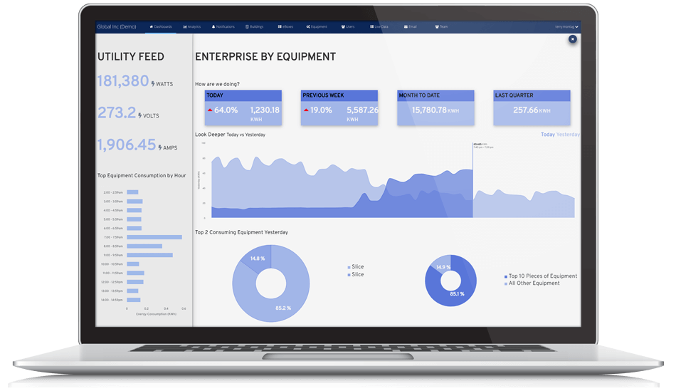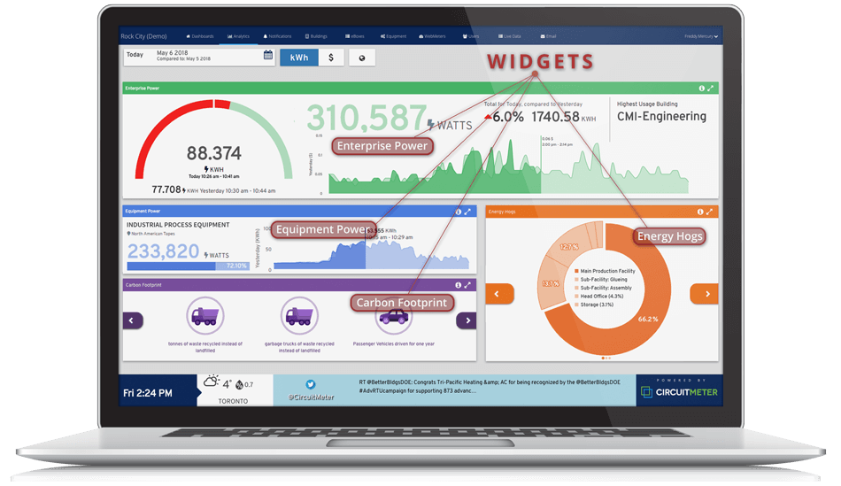 - Main View (Widget Mode); Summary view showing real-time data with comparisons by date range for the Enterprise, Equipment, Energy Hogs and Carbon Footprint